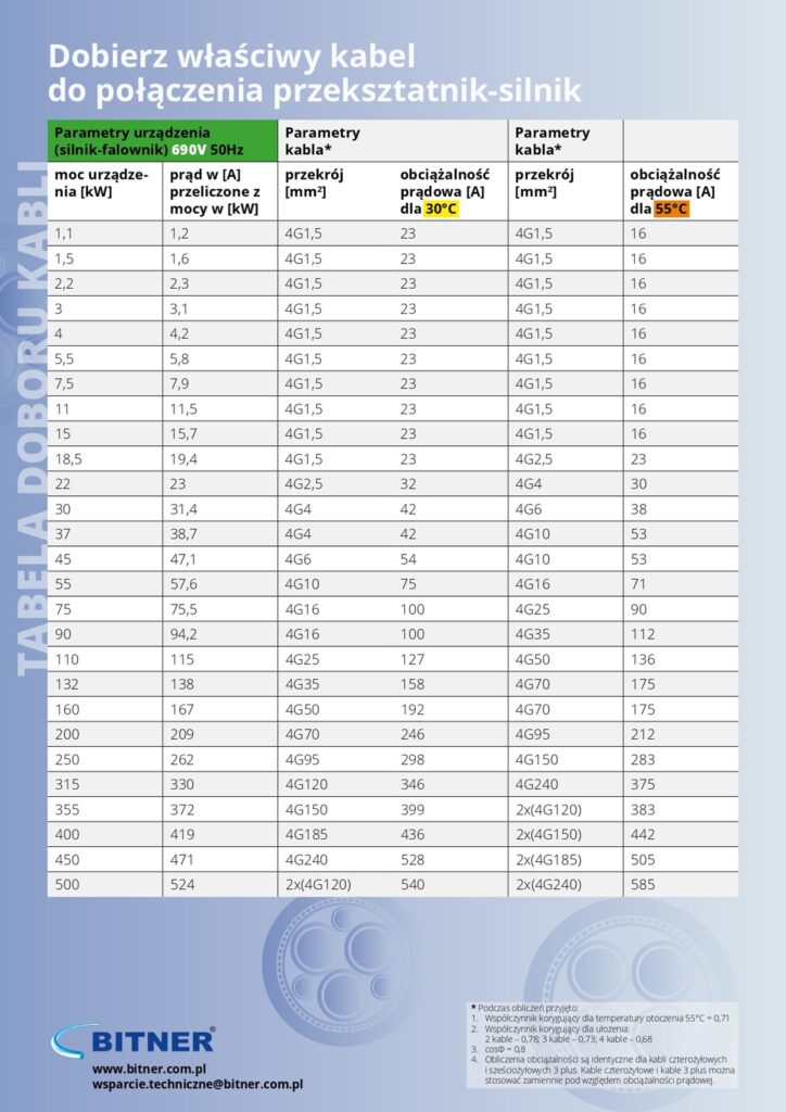 Zdecydowanie najważniejszym parametrem, który trzeba wziąć pod uwagę jest moc silnika. Wraz z jej wzrostem konieczne staje się stosowanie kabli o coraz większym przekroju i obciążalności prądowej. Dla urządzeń o niskiej mocy, nieprzekraczającej 15 kW, w zupełności wystarczą czterożyłowe przewody o przekroju 1,5mm2 i obciążalności prądowej wynoszącej odpowiednio 23A i 16A przy temperaturze 30°C oraz 55°C. Jednak już dla silników o mocy np. 90 kW trzeba dobrać produkt o przekroju 16mm2 lub 35mm2. Na końcu artykułu znajdą Państwo tabelę doboru kabli, która pomoże w wybraniu optymalnego kabla do połączenia przekształtnika z silnikiem w zależności od jego parametrów.